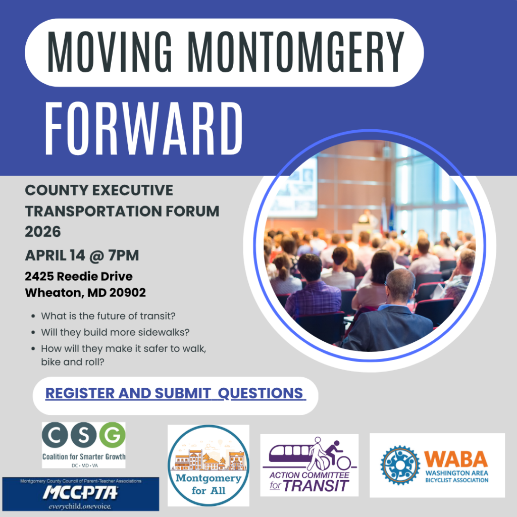 CSG and Montgomery for All join WABA, ACT, Bike MD, and the MCCPTA in co-hosting a nonpartisan Montgomery County Executive candidate forum focused on policies for walkable, bikeable, transit-accessible communities. The forum will be held at the Parks and Planning building in Wheaton. RSVP to let us know you’ll be there!